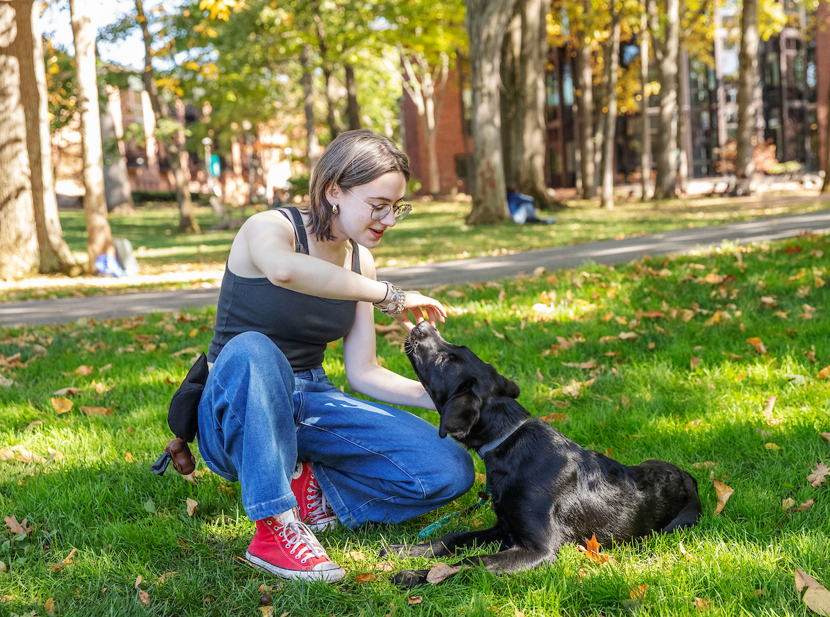 However, living with Finn has changed her daily routine quite a bit. When she wakes up, she takes Finn for a walk and practices his commands. Then she gives him breakfast and plays with him to get his energy out before class. They go everywhere together — from hangouts on Case Green to psychology lectures. “The hardest part is definitely balancing normal life at college with taking care of him,” Lucy says.