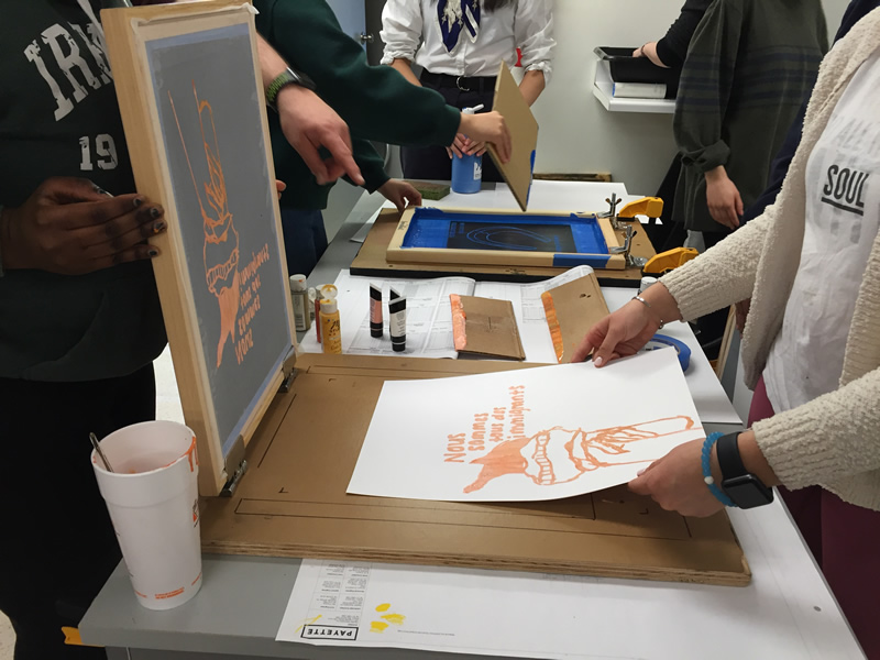 In this French assignment, students use screen printing to create political posters in the tradition of the protest posters of the student uprising in Paris in May 1968. The assignment offers students the opportunity to deploy the visual and linguistic strategies they have studied from these historical documents, and to engage with collaborative making as a form of activism.