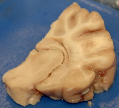 Slice E is the most posterior slice. We can tell that this slice is posterior because of the appearence of the fornix. Once the fornix appears, what was the caudate becomes to thalamus. The hippocampus also appears. Corpus Callosum | Thalamus | Fornix | Hippocampus