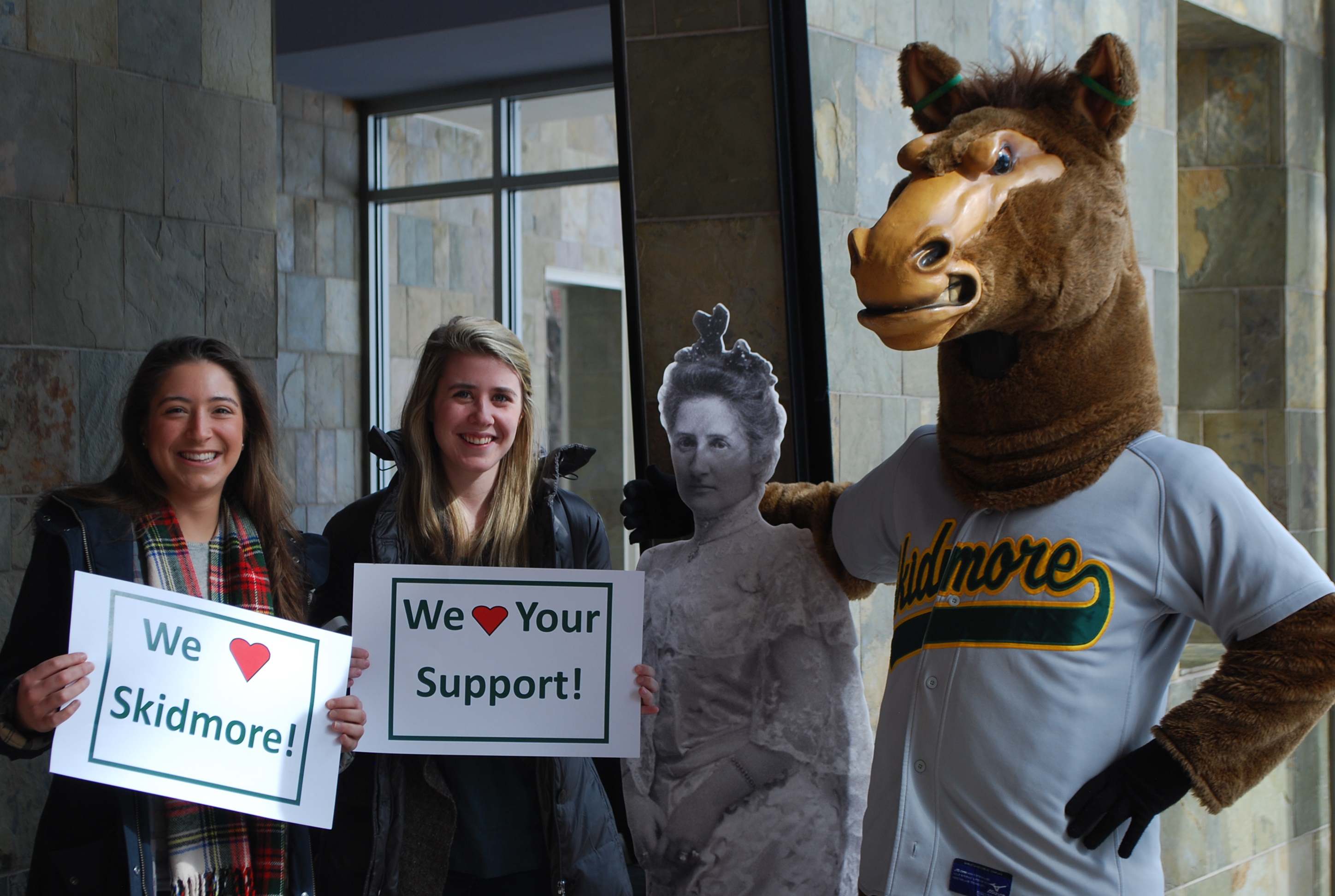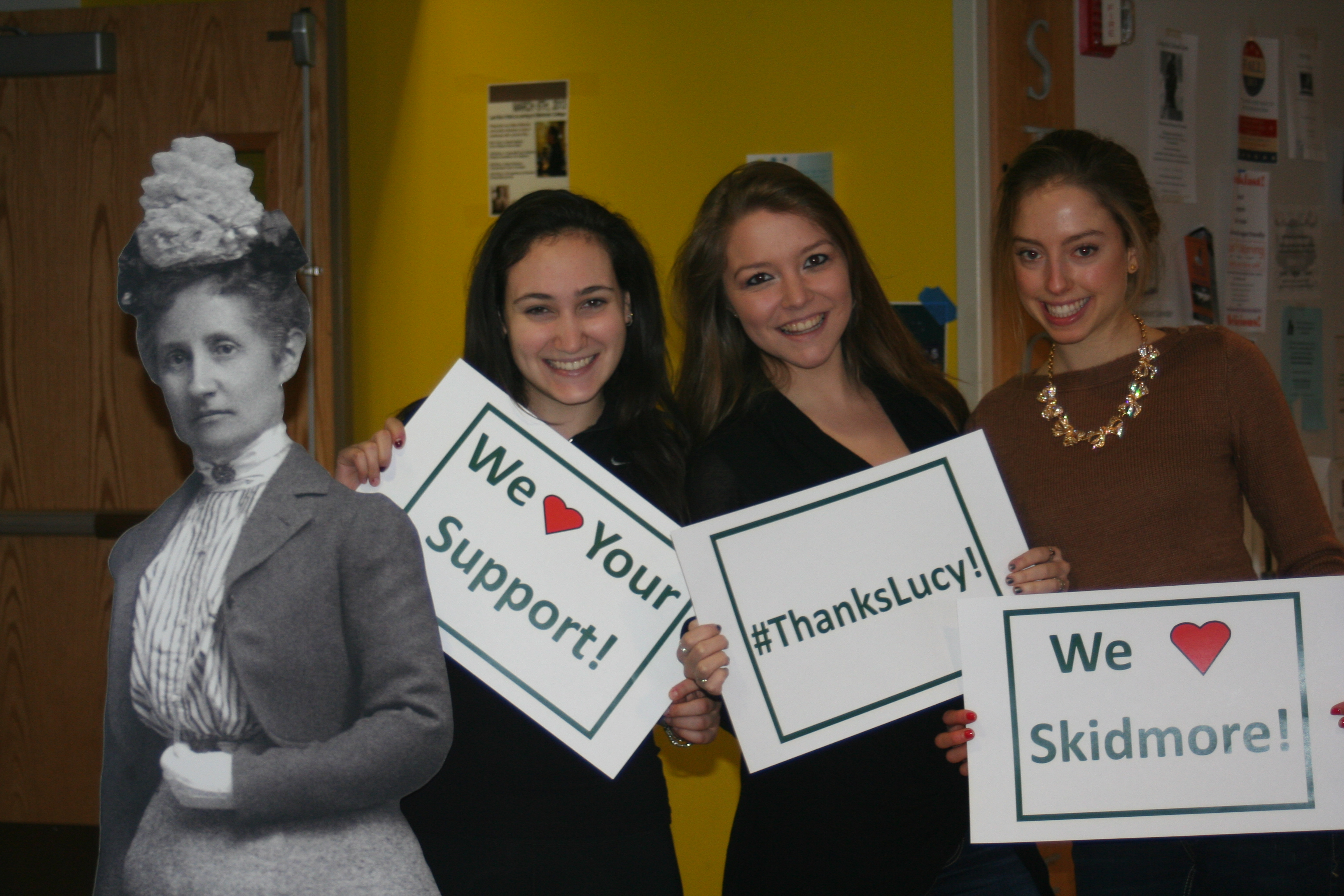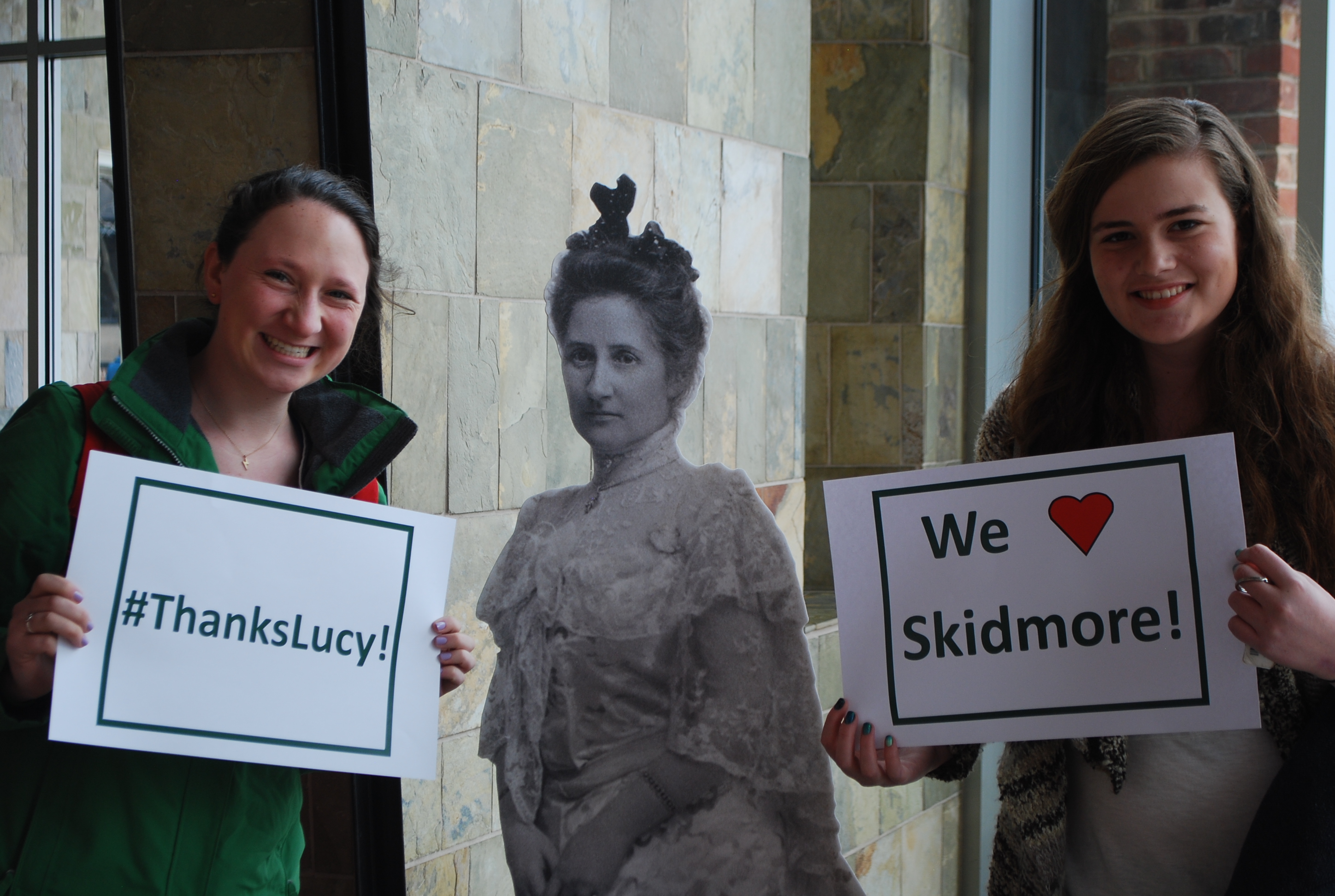 More than 100 colleges and universities held similar events for National Student Philanthropy Day, organized by the Council for the Advancement and Support of Education to raise awareness about the effect of donor generosity on the daily lives of students. Skidmore’s celebration featured green- and yellow-iced cupcakes, “thankslucy” wrist bands, photos with a life-size cardboard cutout of College founder Lucy Skidmore Scribner and with the Thoroughbred mascot Skids Scribner, and tweets using #ThanksLucy.