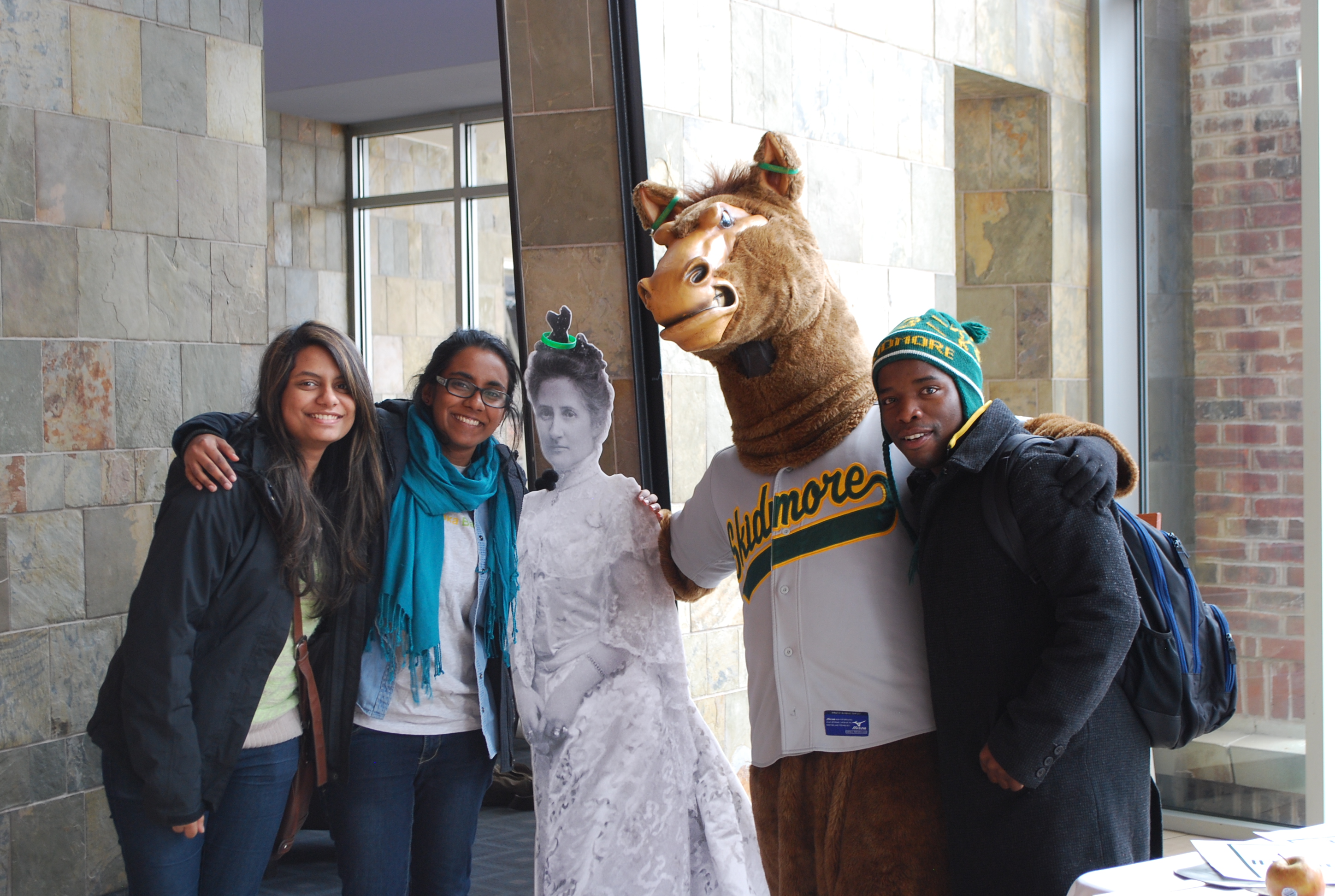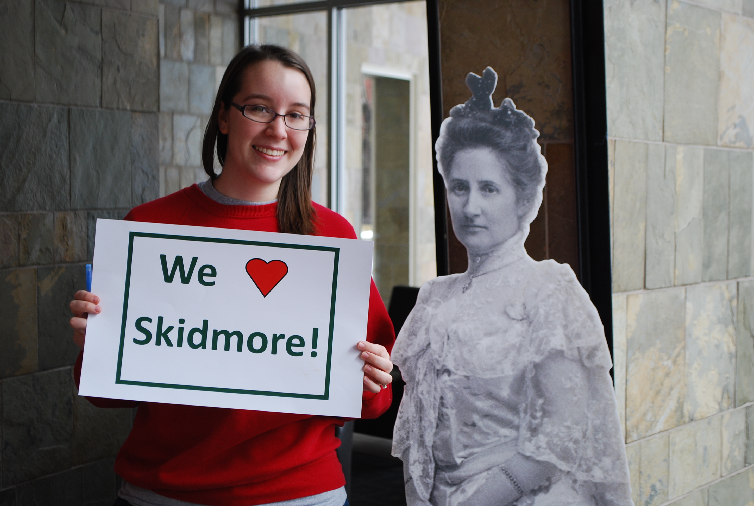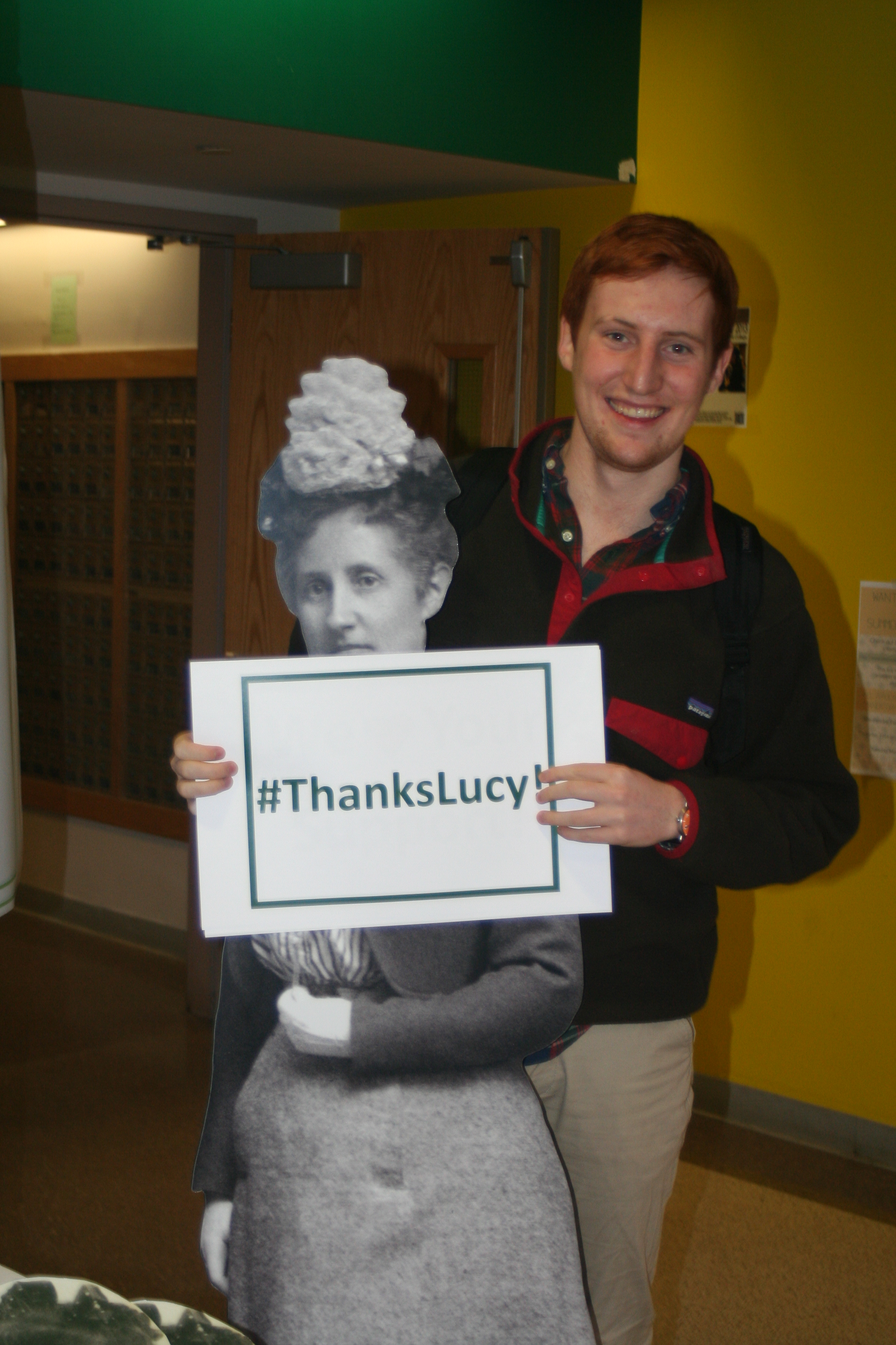More than 100 colleges and universities held similar events for National Student Philanthropy Day, organized by the Council for the Advancement and Support of Education to raise awareness about the effect of donor generosity on the daily lives of students. Skidmore’s celebration featured green- and yellow-iced cupcakes, “thankslucy” wrist bands, photos with a life-size cardboard cutout of College founder Lucy Skidmore Scribner and with the Thoroughbred mascot Skids Scribner, and tweets using #ThanksLucy.