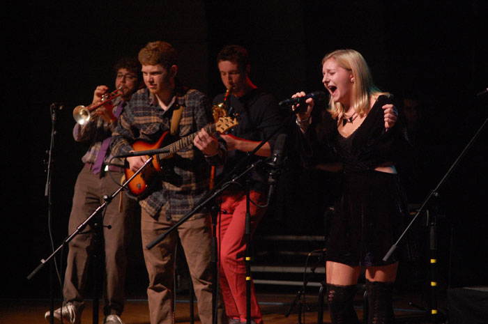 Launched in 2001, this signature Skidmore event now functions like a well-oiled machine, starting with the declaration of the event theme by Gordon Thompson, professor and chair of music, and ending months later on the main stage of the Arthur Zankel Music Center with a remarkable display of student creativity and talent. In between, dozens of bands audition and students in Deb Hall’s Communications Design class come up with the logo for posters and T-shirts. A major goal always is to raise a substantial sum for Skidmore Cares, the College’s outreach program to help those in need in the community, and student financial aid.