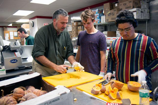 “I volunteered a good amount in the garden at the beginning of the semester, so I thought it would be fun to volunteer at the Harvest Dinner,” said environmental studies major Andres Durante ’21 as he chopped vegetables the afternoon before the dinner. A course he’s taking, Environmental Education with Assistant Professor A.J. Schneller, also stresses experiential learning through volunteer work.