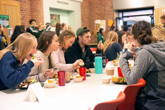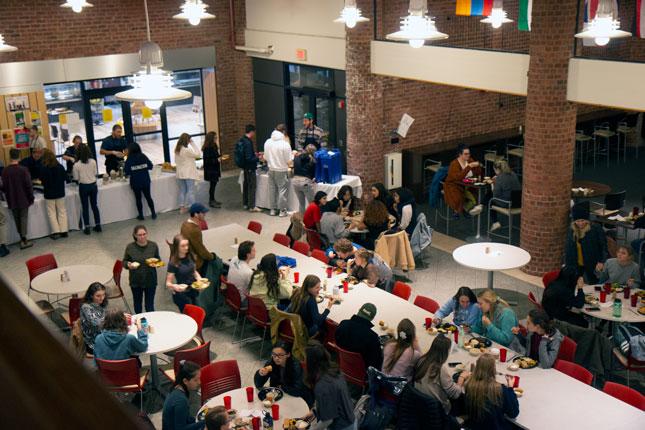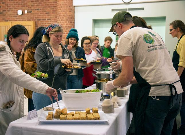 Students enjoy the vegetarian and vegan dishes prepared for the Harvest Dinner with ingredients from the Skidmore Community Garden and New York state farms.