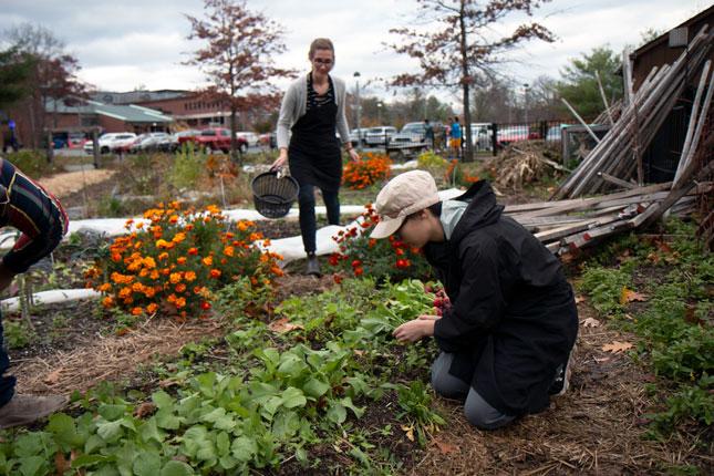 Dozens of student volunteers lent a hand over Harvest Dinner weekend, picking, prepping and serving the food and keeping the buffet trays full.