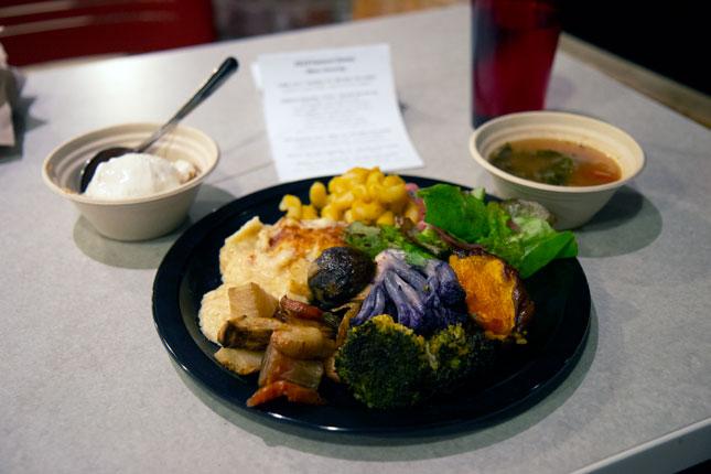 To minimize waste, members of Skidmore’s Compost Club collected diners’ food scraps and compostable bowls, and the club Feedmore gathered leftovers to donate to local food pantries and organizations.