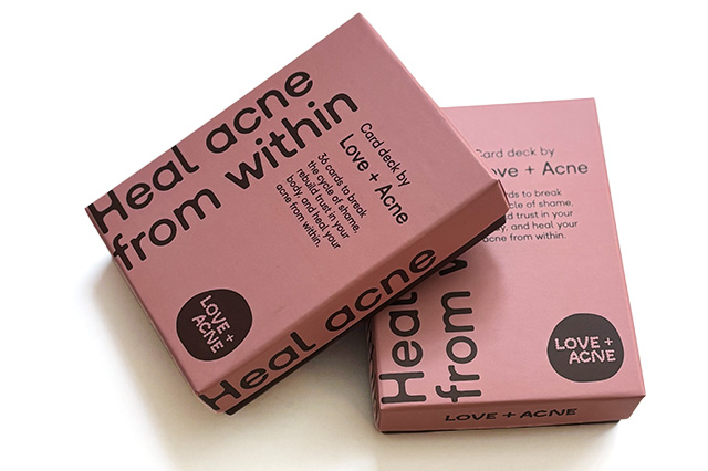 Love and Acne’s mission is to “heal acne from within” and to change the narrative from criticism to curiosity. The first product is a set of affirmation cards that draws on four pillars: mind, body, lifestyle, and community.