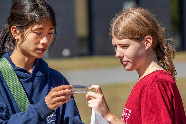 Ashley Cardona ’29, left, and Vanessa Tang ’29 smile as they examine an insect they captured as part of our seminar’s inventory of pollinators at the site of our future garden, outside the greenhouse of the new Billie Tisch Center for Integrated Sciences.
