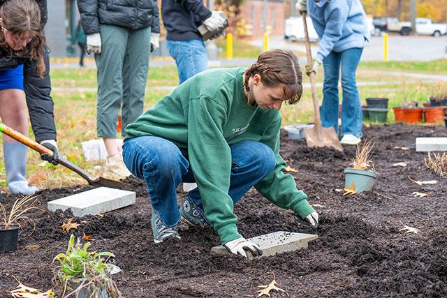 We place the pots of seedlings in tentative locations — first the buttonwood shrubs and New York ironweed as our tallest layer, then species like hairy beardtongue, mountain mint, and dense blazing star arrayed around them. We add two walkways of paving stones, arrange shorter species like pearly everlasting and columbine near the front, and intersperse the grasses. When we’re happy with the layout, most of the students start planting, while a few circulate and add labels.