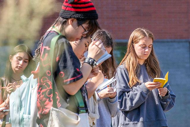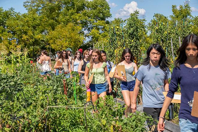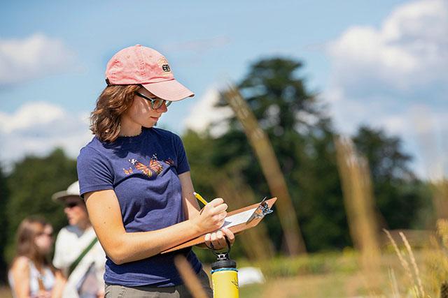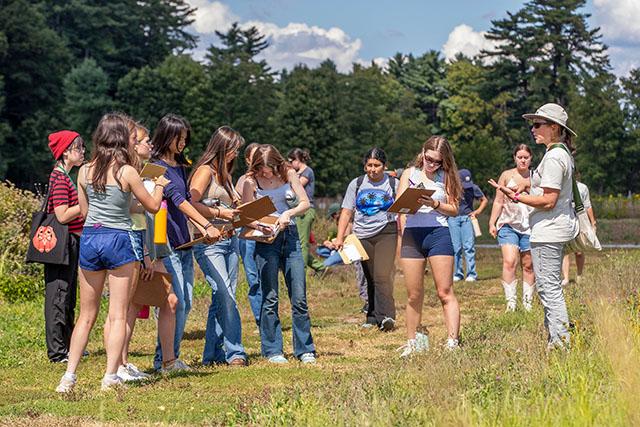 Ashley Cardona ’29, left, and Cecilia Cangiano ’29 take notes at Pitney Meadows on species of native plants as first-year students consider what plants to include in our campus pollinator garden.