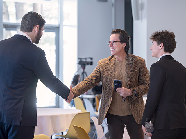 Opportunities to network with and learn from industry leaders, including Skidmore alumni, is a hallmark of the competition. Here, Bill Caleo ’99 (center), co-founder of The Brooklyn Home Company and a judge for the finals, shakes hands with Milo Flamenbaum ’26 (left) and Tom Fuller '26 of Rally, which placed third.