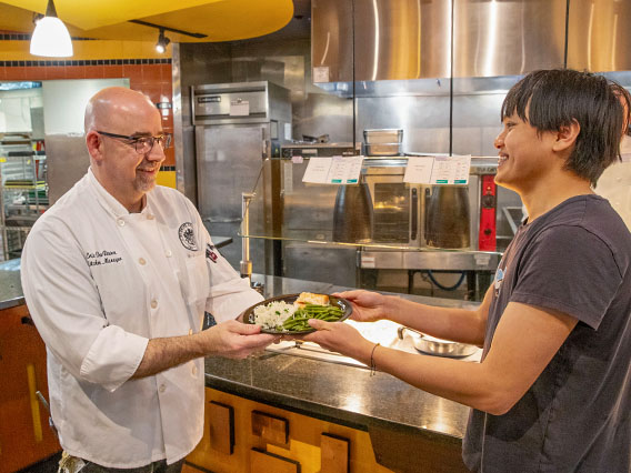 Kitchen Manager Eric DesRosiers serves a dish to Skidmore student Hui Zheng ’27 in Murray-Aikins Dining Hall.