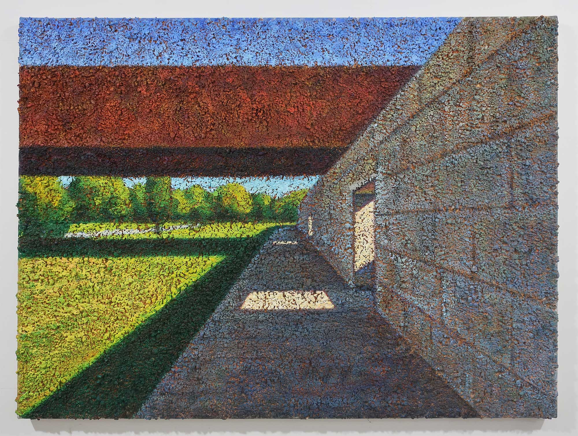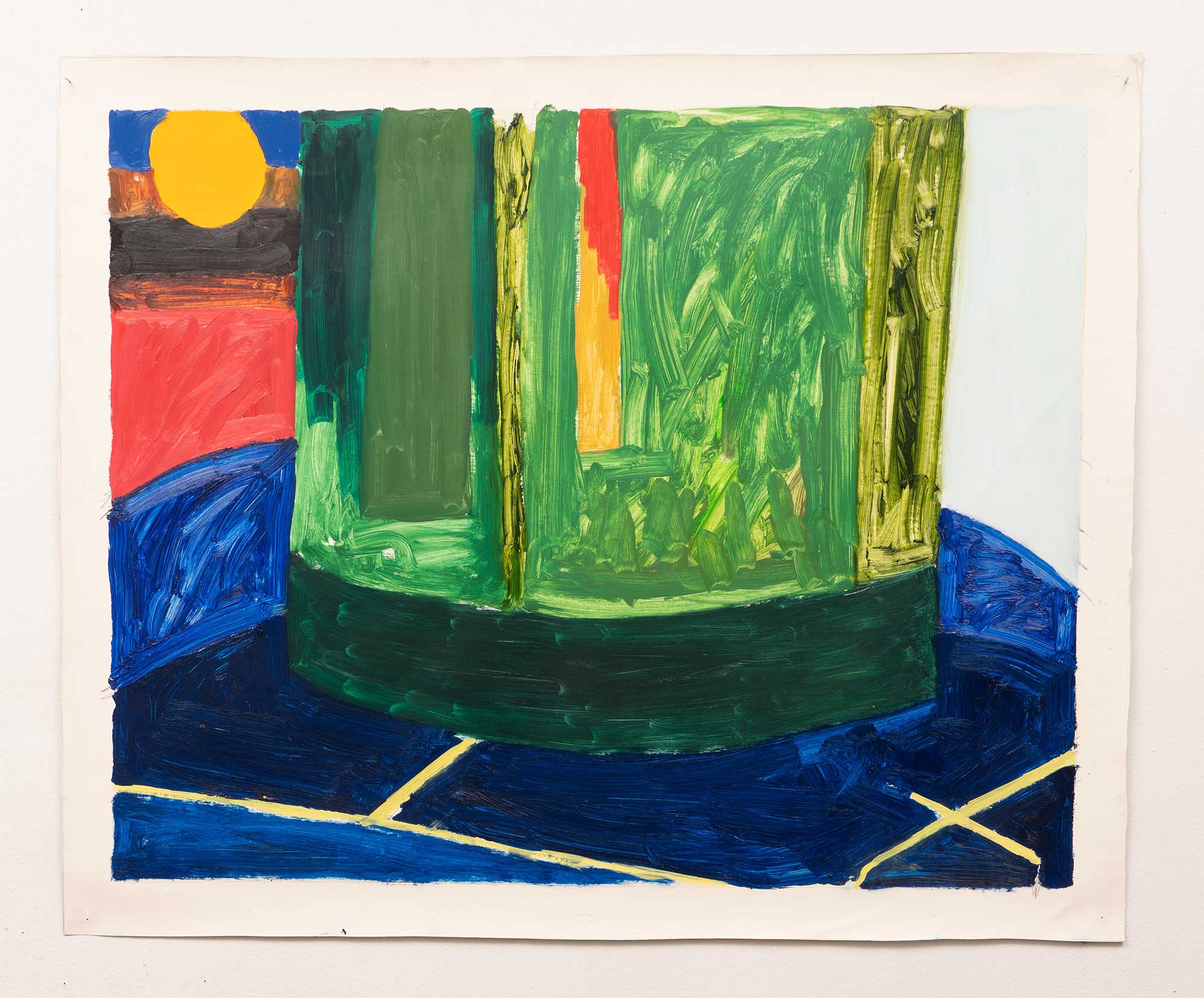 "Magip" (like magic, but different), can happen when making takes on a life of its own and follows its own decisions. It is like climbing a tree too fast. Much of my work is made in sequences, iterations and permutations. When making paintings, prints, drawings, photographs and sculptures, the shift from one surface to another investigates rhythm and how humans think, use intuition and process the world through images, symbols, language and memory. Working iteratively (building upon previous forms, making fractal changes) is how I process the world and believe it can signal social possibilities. Small elements interact to form complexity. Earlier this year, I was making a series in my studio working mostly from memories, forms from past works, photographs, and imagined landscapes. In an impulse to switch up my way of working, I took a canvas outside. My studio is located in Chicago at the confluence of interstate highways 90, 55, and 94. It feels like a heart, or at least the meeting place of some of the major arteries of the city. Holding up the highways are these enormous concrete pilings. Perhaps like a landscape painter's affinity towards trees, I was drawn to the column. I focused on where the column and sidewalk converged, placing the bottom of the column almost in the center of the horizontal image. I also drew the architecture of the sidewalk and a fence and tree in the distance. I finished the painting in my studio, but soon realized I was not done with this form. I started repeating the composition, making fractal changes as I painted iteration after iteration. I tried different painting approaches, using a variety of surfaces ranging from glossy to matte, made prints, and accepted tangents. The sidewalk started changing from a hard lined, slightly curving form, to a bulbous, squiggly mass pushing against the left edge of the image. Shapes started to intersect the column, building upon its energy, but also began introducing new referents and emotions to the work. It gained and lost history, as it morphed into something new.