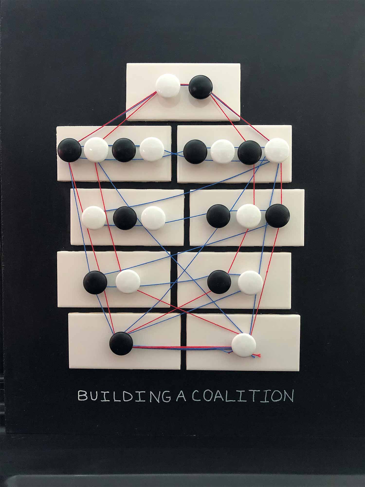 I have been working on a series of studies called "Home Improvement." The concept of home improvement encompasses the dichotomy between renovations to my own homes over the years, and the found objects, materials, waste and repurposing that is an outgrowth of that process, to the need to reform our country's current socio-economic and political situation; including racism, gerrymandering, voter suppression, gun control, food insecurity, environmental issues and other injustices. It seemed absurd at times that I would be preoccupied with what color to paint a room or whether my windows needed to be replaced while others have no home or are being displaced from them, are hungry or in need. We as consumers amass so much stuff and I decided to use these resources and take discarded, regular household materials and use them in a new way. My connectivity to the physicality of items, of objects that can tell a story, made constructing assemblage pieces make sense. Upcycling materials that one would use for home improvement: plywood, house paint, nails and screws, old knobs, construction glue, etc. has given me an outlet to explore some of the issues facing our world today and grapple with how to improve our home, the United States, and the entire earth.