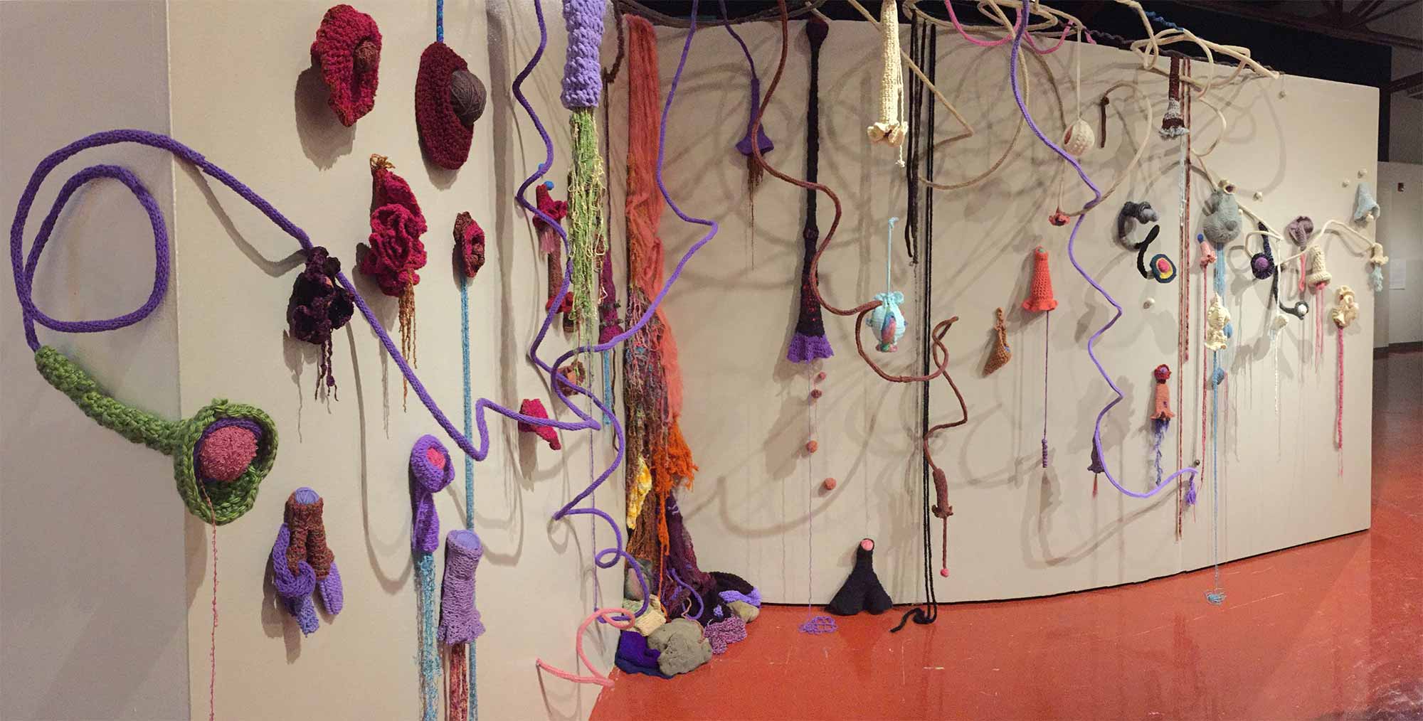 "Hekate's Dream" is the working title for my colorful crocheted and knit installation, built from funnel-like shapes referencing desert plant forms and blooms. It is as if the archaic domestic goddess Hekate dreamed of a desert landscape where distorted plants give way to surprising blooms, funnels deliver water and disrupting whirlwinds come and go. Working with the yarn, thread and cloth to "find" the imagery, I imagined myself at all ages in half-remembered rooms with my mother and grandmothers. We talked and talked while we knit sweaters and darned socks, patched and crocheted, made hooked rugs from old wool suits and fashioned quilts from old cotton dresses. Sometimes, elegant designs resulted, but at other times we were making repairs and "making do," transforming the scraps of yesterday into something new, useful and beautiful. Other artists participated in "Hekate's Dream" by crocheting some of the desert blooms. My friend Sherry Sugg '71 sent a unique and imaginative orange bloom. An angora hat my mother Miriam had crocheted years ago also made an appearance in the installation. The project was supported in part by a Hartwick College Trustee Research Grant. (www.hartwick.edu). To view a video of the installation click here.