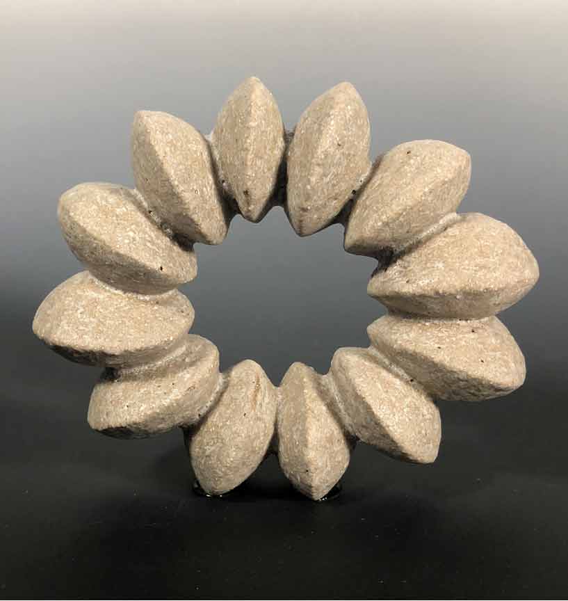 Experimental communities influence my work; they epitomize our best and worst instincts colliding. "Drop City" was an early (1965) commune in Trinidad, Colorado. At the trash yard, Droppers would use axes to cut out car hoods for their geodesic domes. Given a Dymaxion Award by Buckminster Fuller in '67, Drop City was abandoned by the early '70s. My pieces suggest the forms and palettes of Drop City and of Modernist architecture and design, with elements of discord. Asian scholar's stones, objects of psychic transport, are also an inspiration.