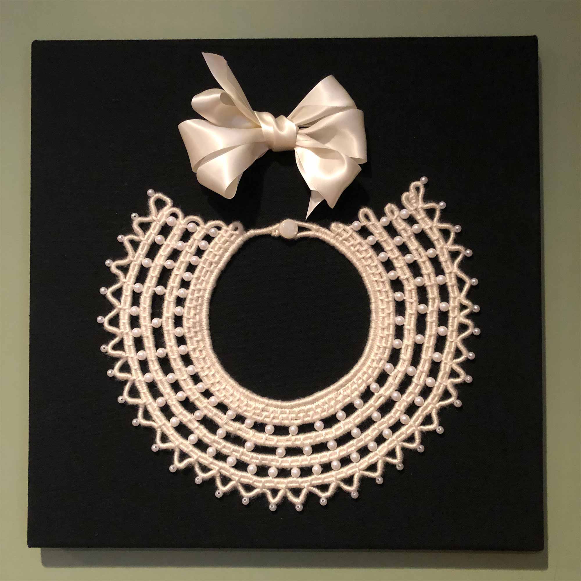 Eternal Now, Eternally Grateful; Fibre and beads In October, just before the momentous Presidential Election, I began my first wreath that was inspired by Ruth Bader Ginsberg's jabots. I was asked to create a wreath for Festival of the Wreaths, a local fundraiser held yearly before the holiday season. Knowing that I did not want to make a traditional wreath, I realized that the circular nature of RBG's signature neckpieces is wreath-like. The method I used to create the piece is called 'coiling' by basket weavers. Coiling is a work intensive technique and for me, it made me think of the tireless efforts of Justice Ginsberg to bring fairness to all, particularly women and LBGTQIA persons. Adding to this meaningful creation, is a wreath's symbolism for eternal life and unity. My artistic endeavor has been my tribute and celebration to this woman who made history. In these times, Ruth Bader Ginsberg's compassion and empathy made the world a better place. She is unforgettable! In 2018, I retired from teaching middle school art in Malden, MA. I had taught art in public schools for 26 years. Following this, I worked for Massachusetts College of Art and Design as a supervisor for art teacher candidates. In retirement, I look forward to continuing to create my own art in multiple mediums and teaching my grandchildren about art. Currently, these art lessons are on Zoom!