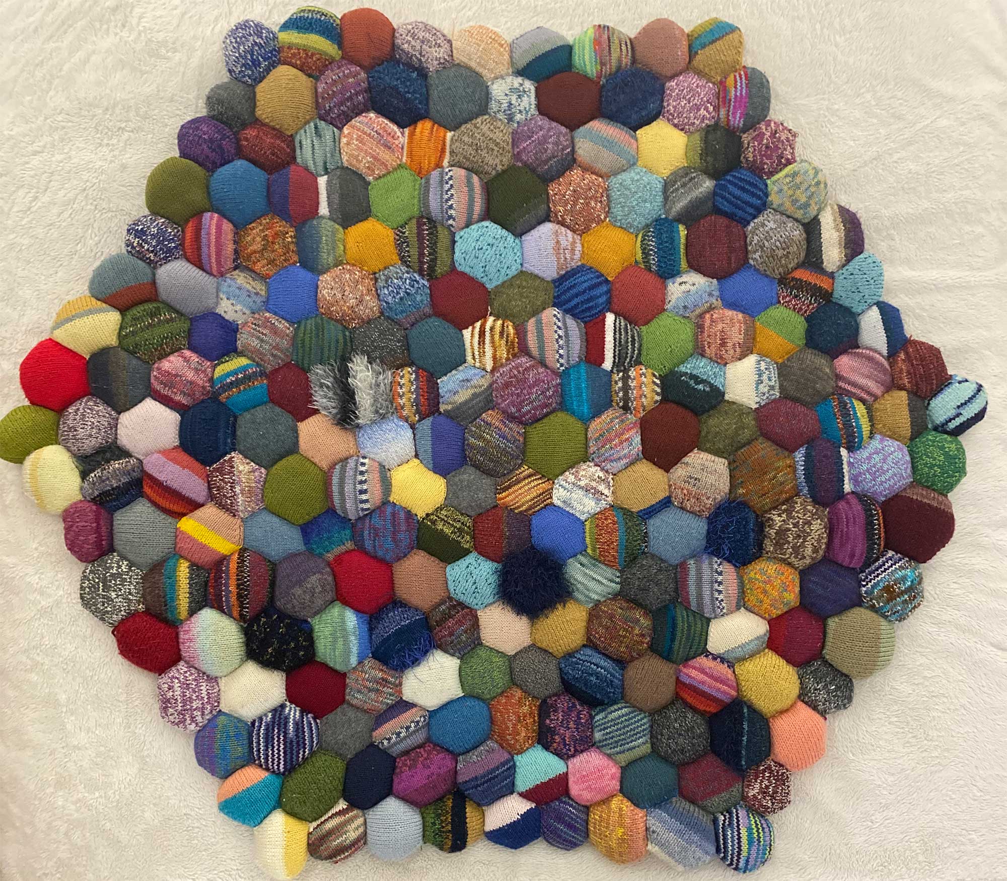 This quilt is heavy and warm. It is a sensory experience to be covered by a quilt made from scrap yarn of all different fibers, textures, colors, and weights. All yarn used was donated by the women of Temple Beth Avodah's knitting group. The quilt began as a way to recycle the yarn leftover at the end of a knitting project. Yarn that was too pretty, too soft, or too precious to discard but not quite enough to start another project. As the quilt grew, the women who donated the yarn would pore over it, feeling the yarn that they had donated and remembering the warm clothes made and memories of when this yarn was used. This quilt was finished in quarantine and admired over Zoom by the women who donated the materials that made it. With over 200 hexagons making up the finished work, it was inspired by The Beekeeper's Quilt.
