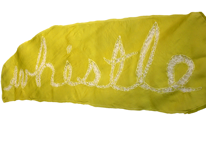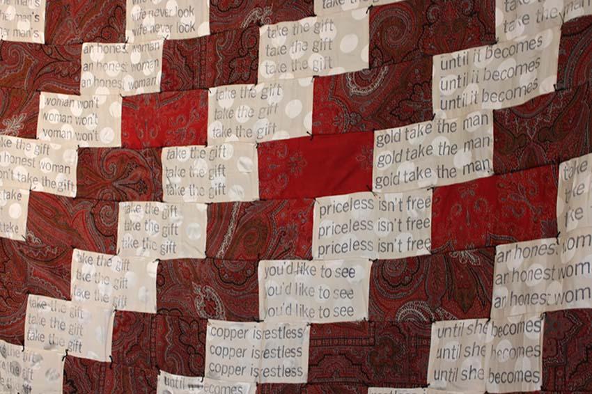 Crux of the Matter presents work by Margo Mensing, (1941 – 2024), Skidmore College Fiber Arts professor, interdisciplinary artist and poet; and Sayward Schoonmaker, Skidmore ’06, interdisciplinary artist, writer, and former student of Mensing. Both artists play with language, using subtle humor as underpinning, and both approach their work through a conceptual lens, starting with an idea and then finding the physical form to best serve it.