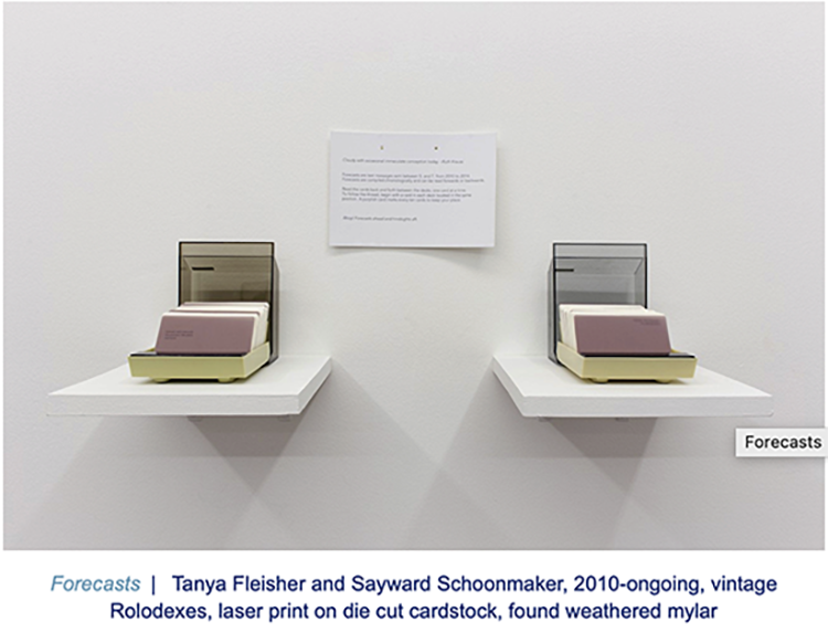 Schoonmaker writes that her own work “most often begins with questions of how words, materials, and structures inform - or construct - ways of seeing and being….Each piece is written and built simultaneously— the material form looking for the content, and vice versa.”
