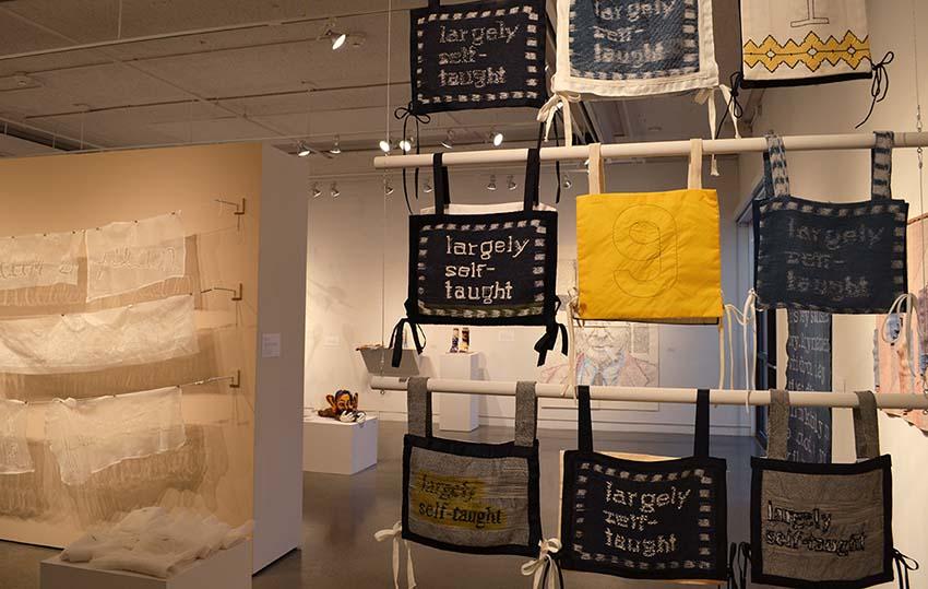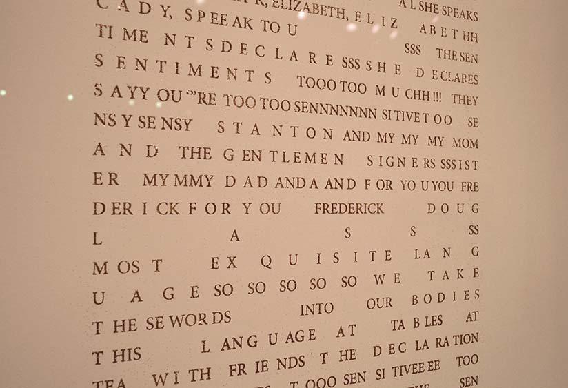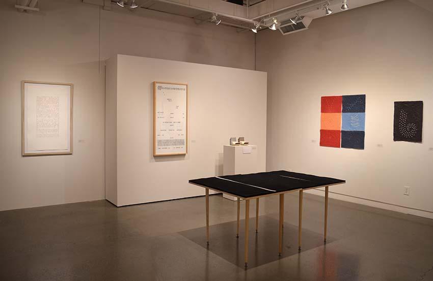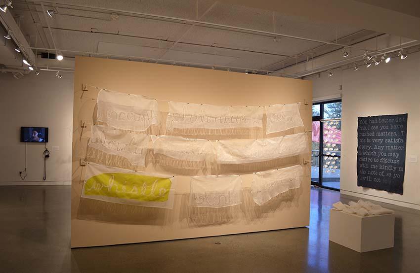 The interactive Hanging Out the Laundry (words cut into sheer fabric pieces that viewers may arrange into lines of poetry) and Dead At (a multi-year project in which she explored the lives of eminent figures and created works that recognize some aspect of their identity) are among Mensing’s works in the gallery.