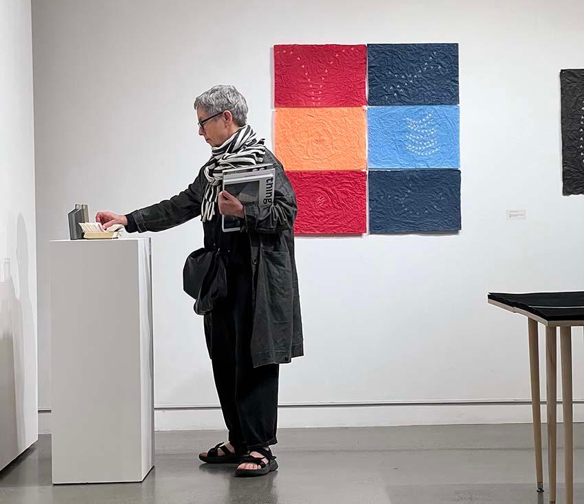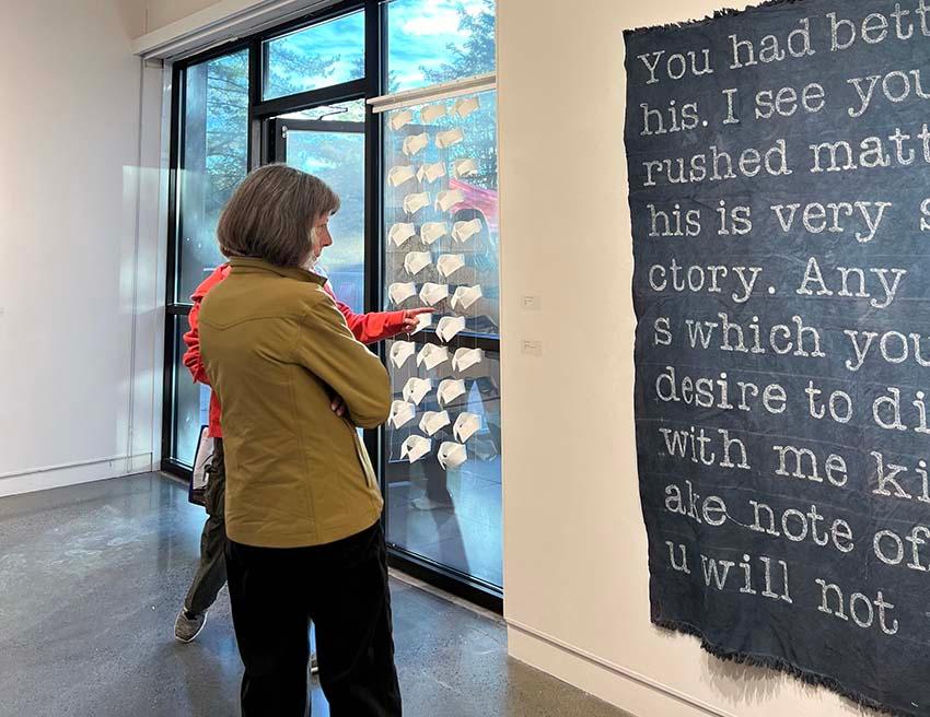 Crux of the Matter presents work by Margo Mensing, (1941 – 2024), Skidmore College Fiber Arts professor, interdisciplinary artist and poet; and Sayward Schoonmaker, Skidmore ’06, interdisciplinary artist, writer, and former student of Mensing. Both artists play with language, using subtle humor as underpinning, and both approach their work through a conceptual lens, starting with an idea and then finding the physical form to best serve it.