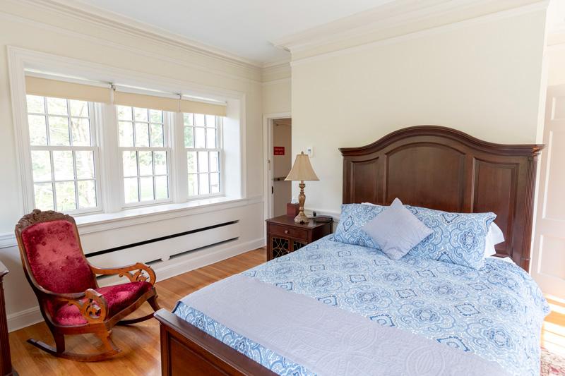 This sunny, corner, second-floor room boasts three walls of windows overlooking both the beautiful back gardens as well as Skidmore's campus. Home to a queen-sized sleigh-style bed, a drop-leaf writing table and a large chest of drawers, this room has an intimate feel.